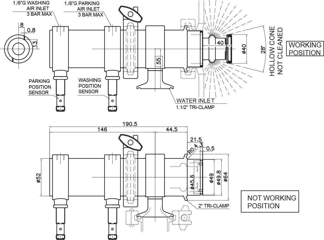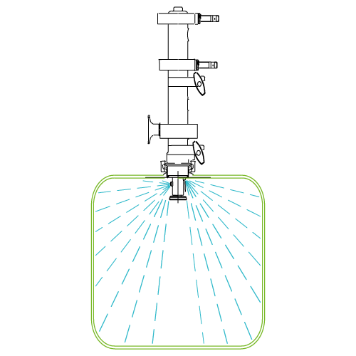 The RT111-P is a rotating cleaning head with linear motion, designed for cleaning machine interiors, pipelines, hoppers, and screw conveyors, in applications where the cleaning device must not interfere with the product during processing.