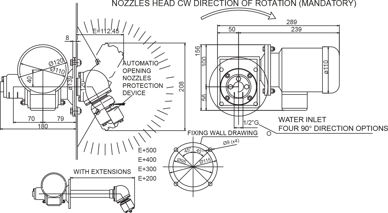 A sector washing head. Designed with axial delivery, it features an automatically opening nozzle protection system. Rotation is driven by a 400 V electric motor.